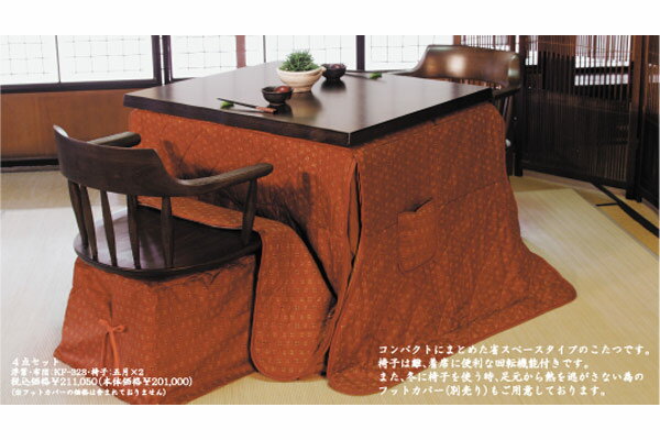 ハイタイプこたつ6点セット【ファミリー&天水&KF-307】(150)送料無料♪【0824ケータイ企画】価格: 259,500円レビュー評価: 0.0 レビュー数:0 ハイタイプこたつ5点セット【ファミリー&天水&KF-307】(150)送料無料♪ カラー ブラウン(SG色) サイズ( cm ) ■コタツ ◇W150×D90×H70(cm) ■チェア ◇W50×D62×H90(座面まで43)(cm) ■掛布団 ◇長方形135?150サイズ用 仕 様 ■コタツ ◇天板材質 : タモ板目突板 ◇本体材質 : ハックベリー材 ◇塗装 : TXLウレタン塗装 ■ヒーター ◇600W石英管ヒーター ◇手元電子コントローラー付き ◇1・3・5時間オフタイマー付 ◇型番 : A-606STR ■チェア ◇ハックベリー材 ■掛布団 ◇表生地:綿100% ◇裏生地:ポリエステ |